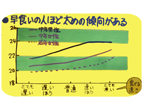 男性の例をとると、食べる速さが「とても遅い」人のBMI平均値が21.8で体型はやや細身。